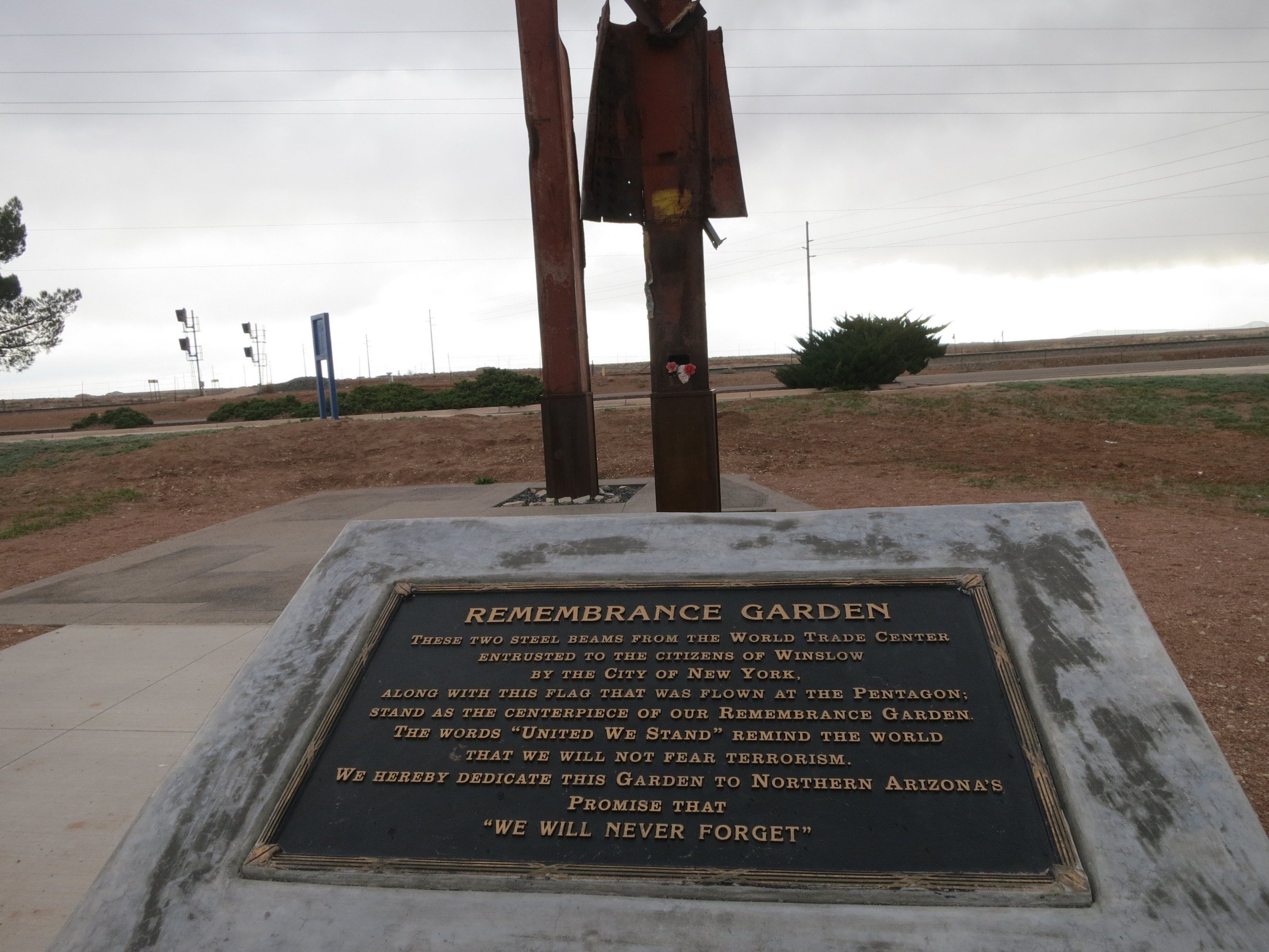 On sojourns around the nation, we did come across Twin Tower girders in Winslow, Arizona.  A memorial park is dedicated to 9/11.