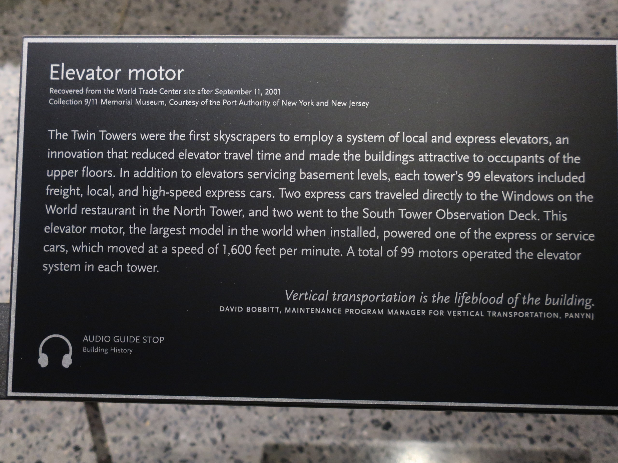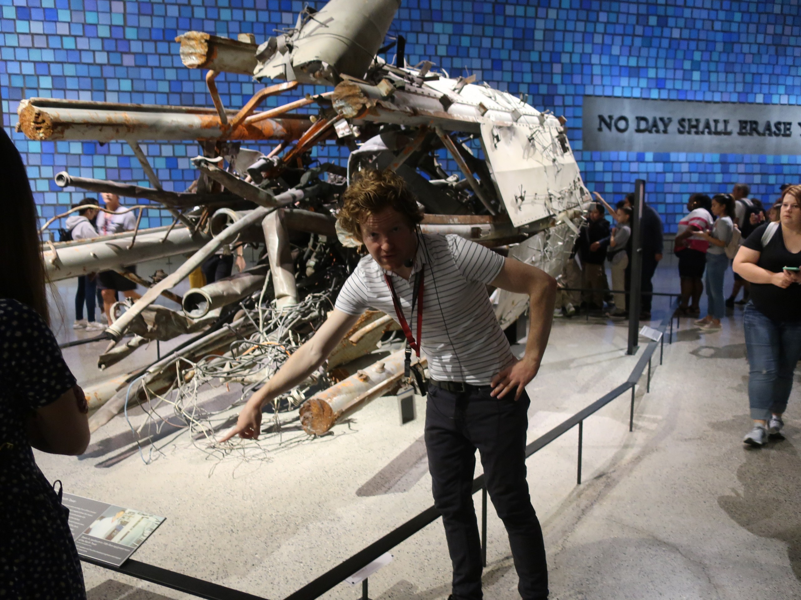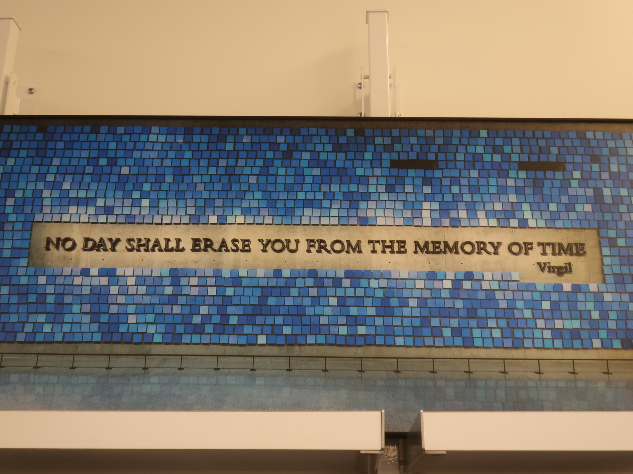 A few of the memories we have taken away from our experience is a wall filled with small blue panels.  Each panel represented one of the 2,606 people that died at WTC. Behind the wall is on-going forensic work still being done.