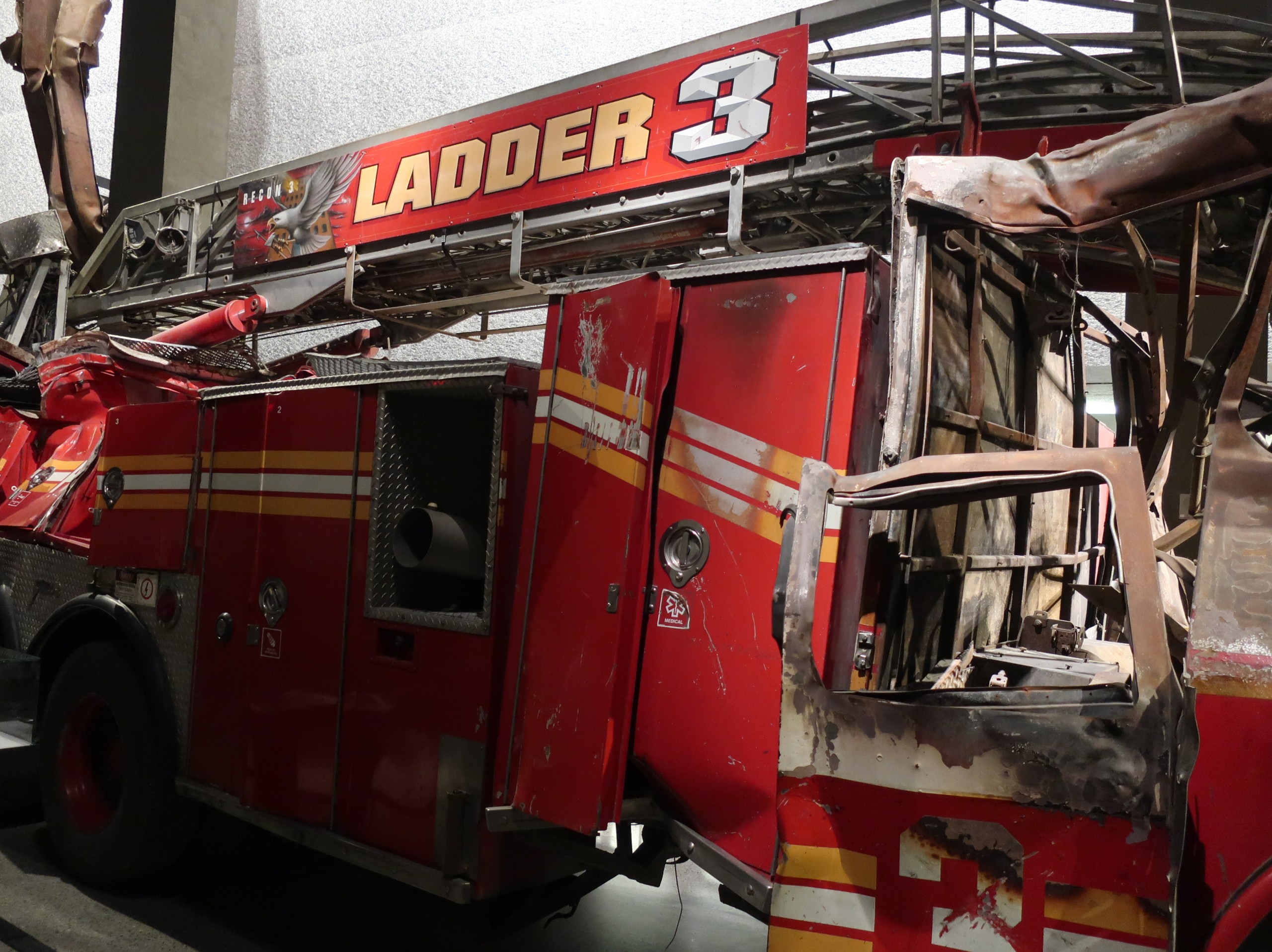 A fully damaged fire-truck is on display.