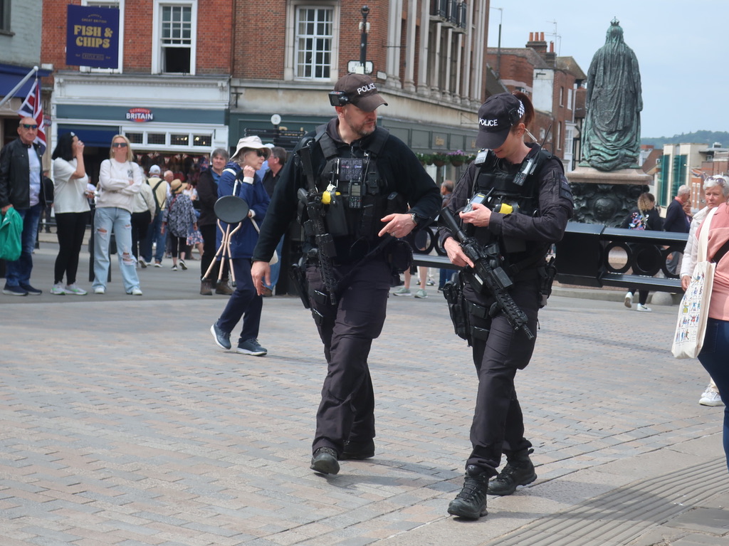 Along the street are policemen well-armed to protect against any ill-will bystanders or even terrorists.