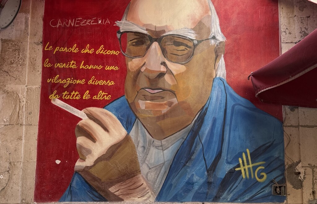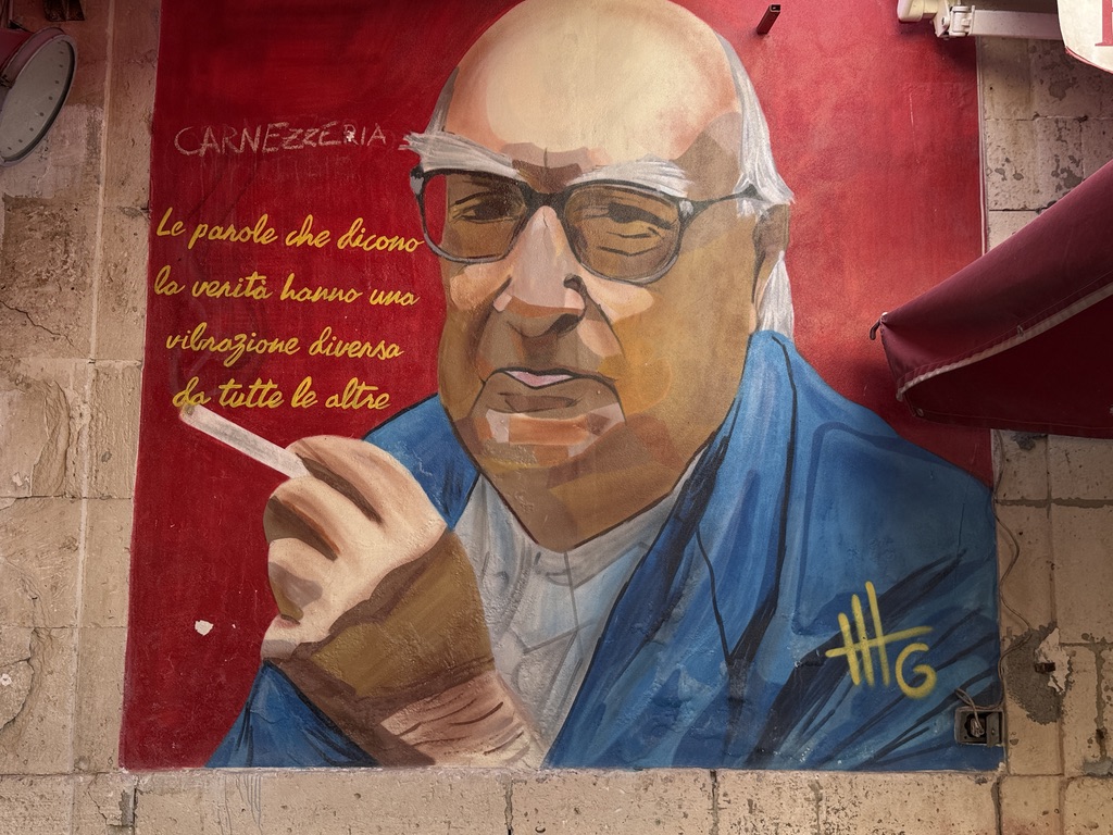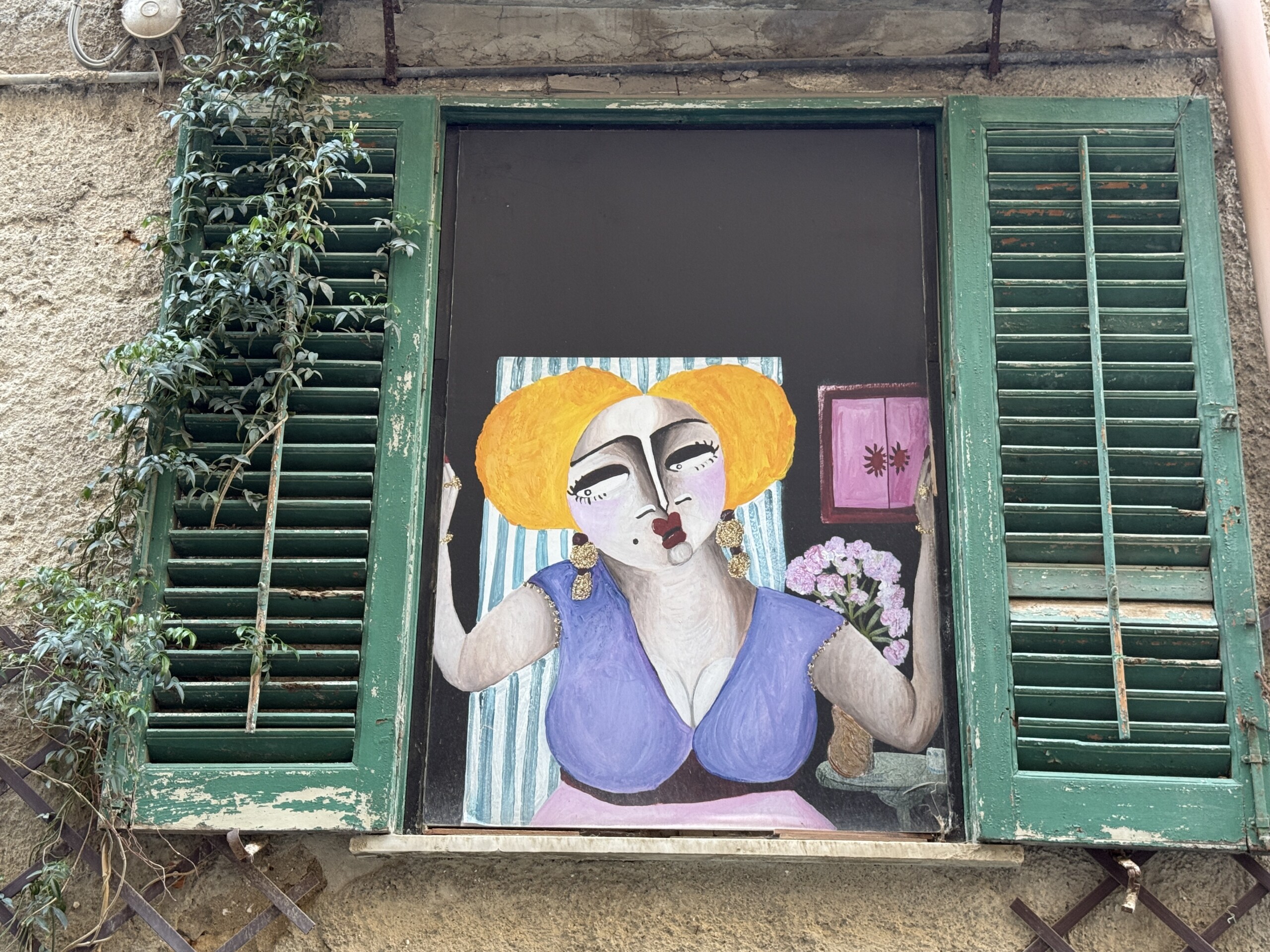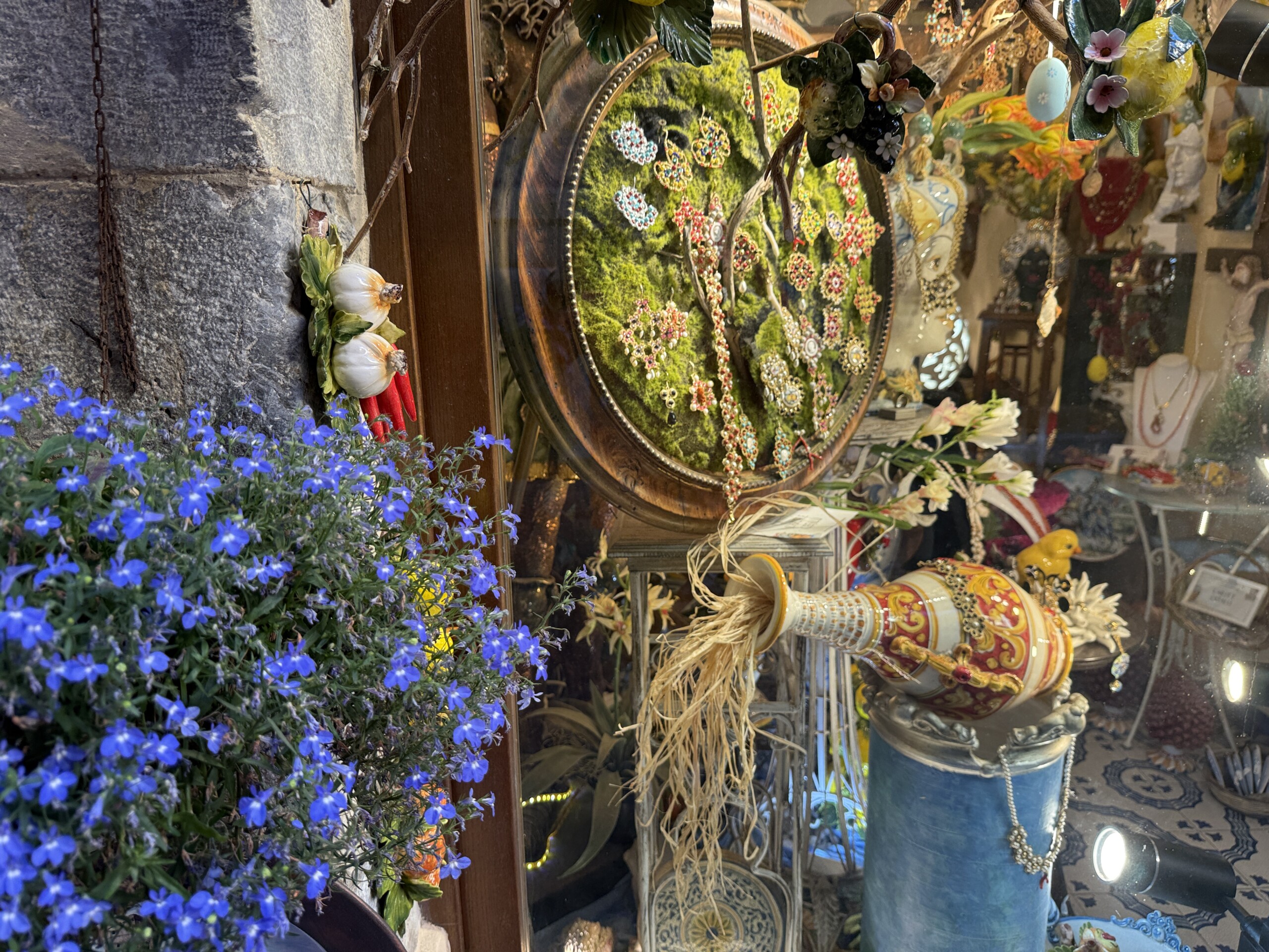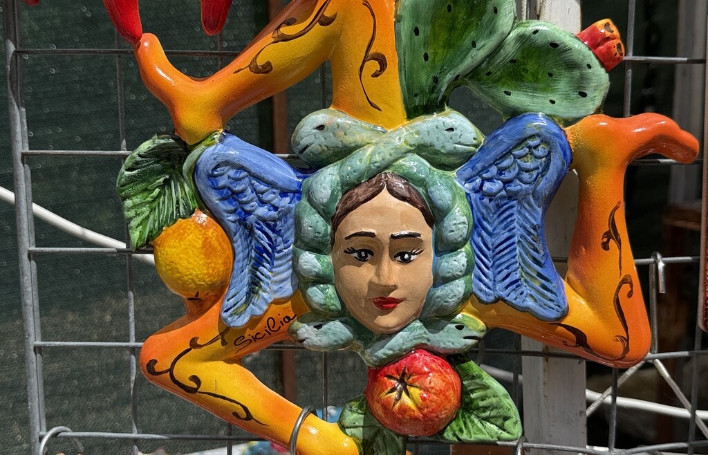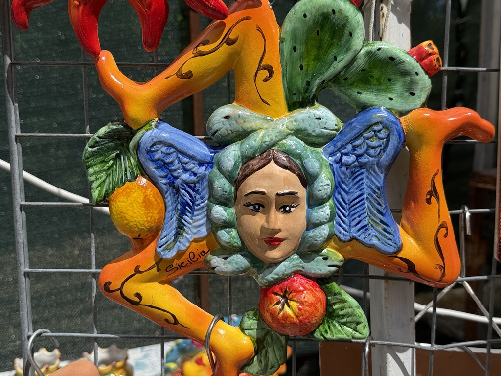 On our first walk in Palermo, we noticed an odd figurine in the windows known as “The Trinacria.” A Medusa like head with three legs. The face is on the Sicilian flag. The three corners represent the corners of the island. This figure dates back well beyond 7th century B.C. Some say it was a symbol to scare off other superstitious settlers.