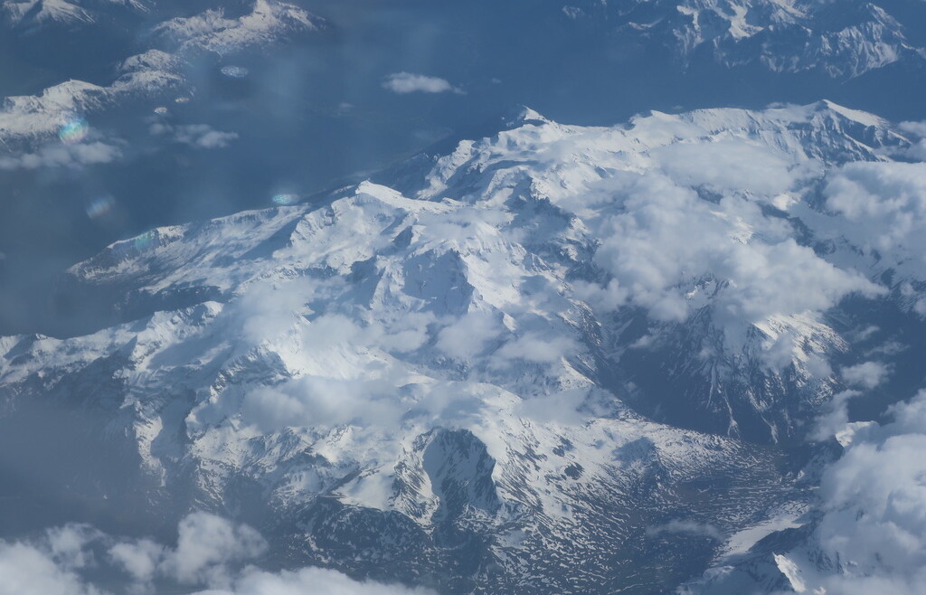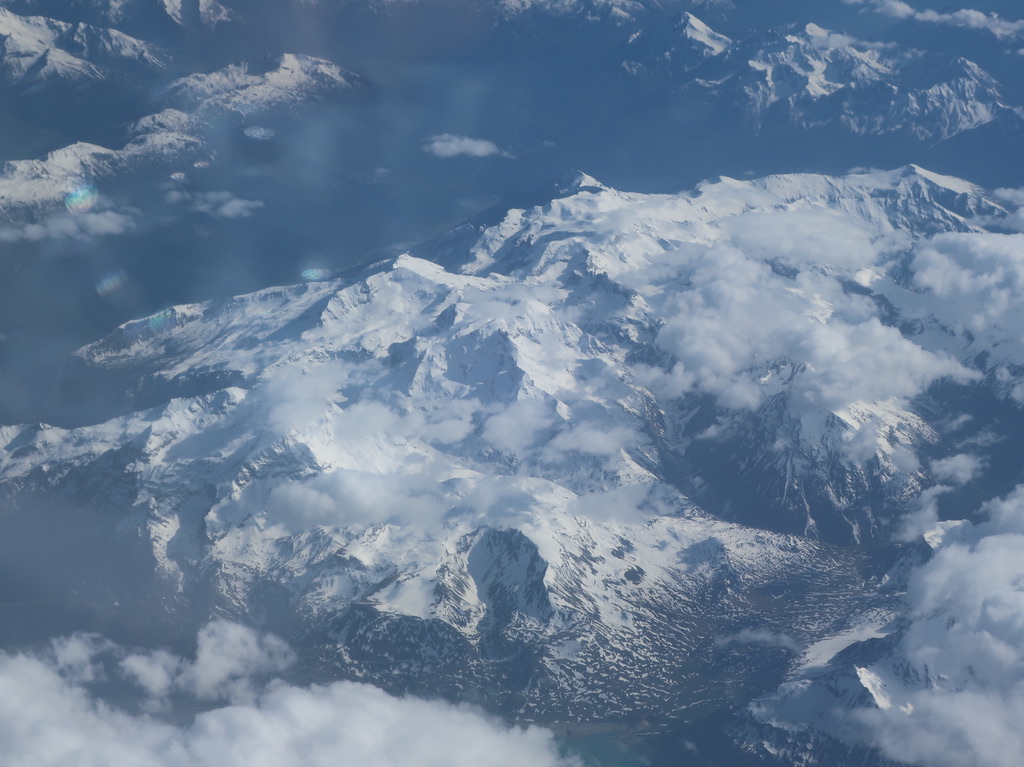 We love flying over the Swiss Alps on a clear day. In May there are snowcapped mountains still visible.