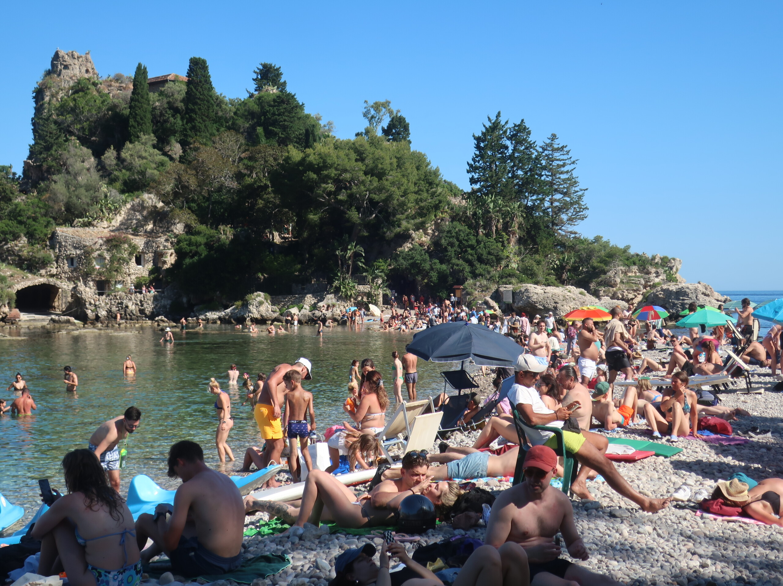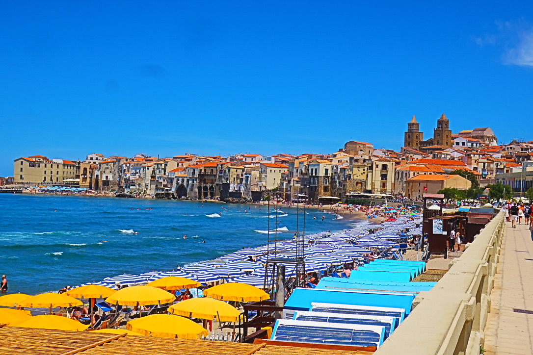 A 2-hour train ride will take you to the beach community of Cefalu. Most beaches on the north coast of Sicily are rocky. Cefalu is the exception. We were there in late May and the place was crowded with beach goers and visitors.