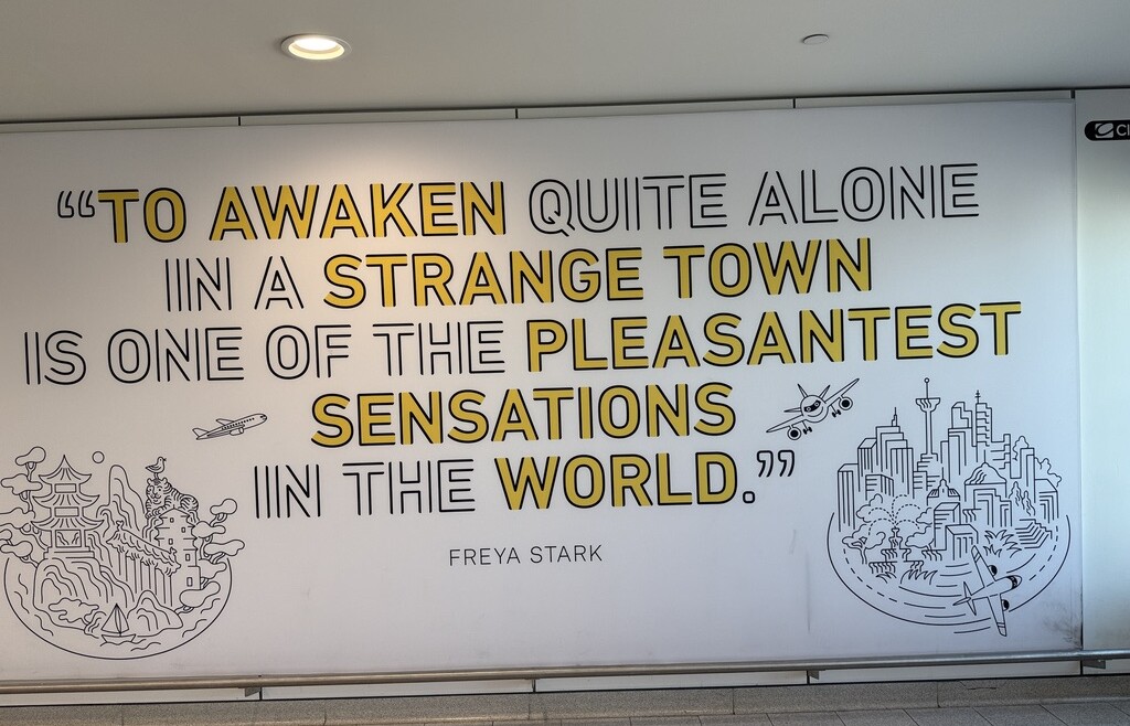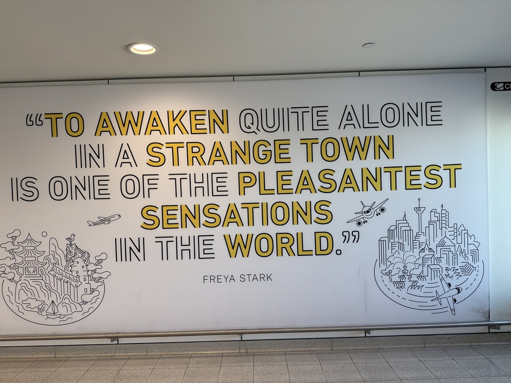 We start most of our journeys from West Palm Beach (PBI). Kathie does not like long flights and thus we break up the flights into smaller segments. She does not like the “small” bathrooms in planes either. We usually take off from the USA to Europe at JFK. The quote we found on a JFK marque is apropos for travelers: