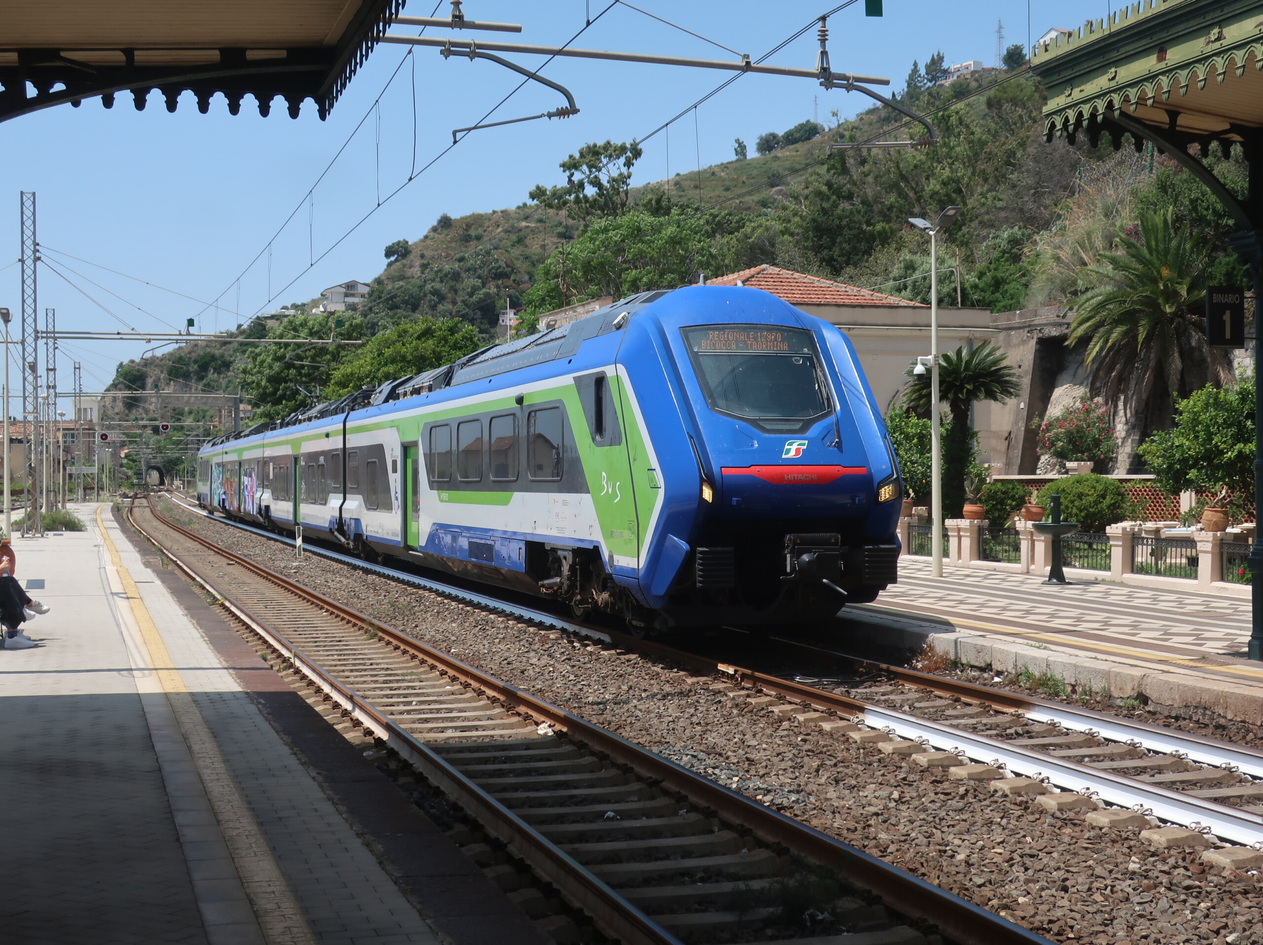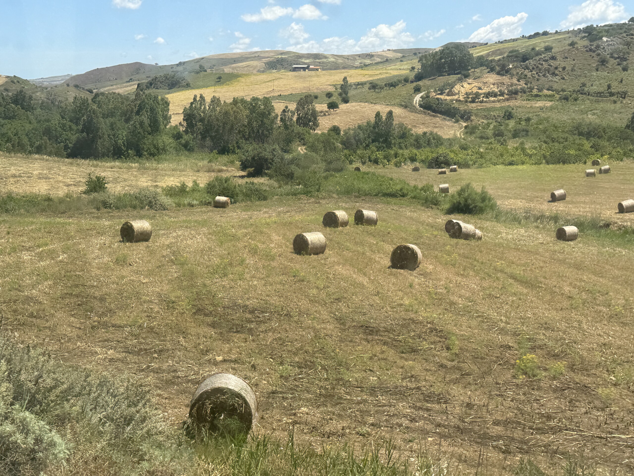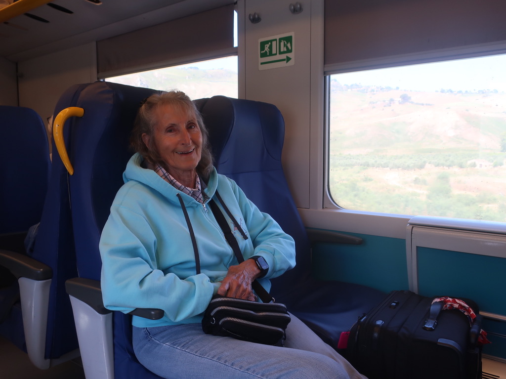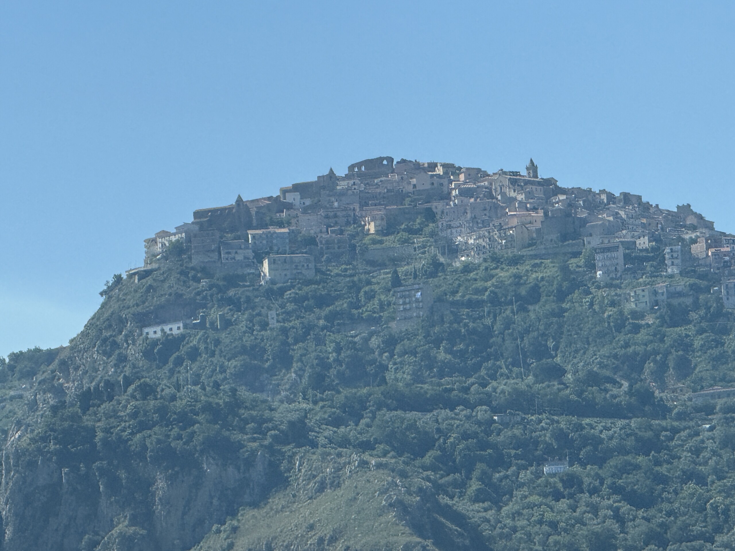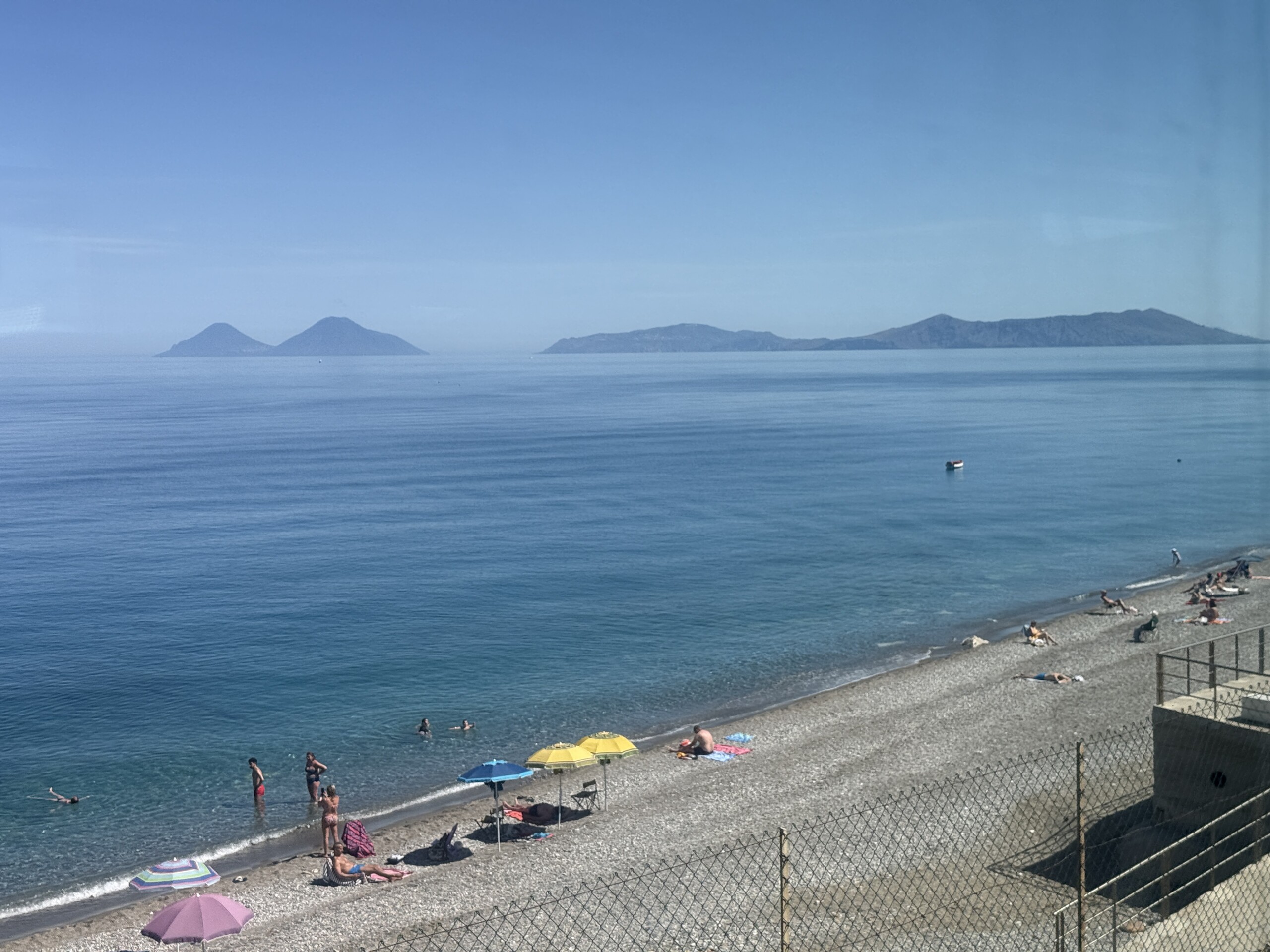 We transferred trains in Messina. Along the way, not far from the city of Milazzo, we saw the volcanic archipelago known as the Aeolian Islands in the Tyrrhenian Sea. Did we see Lipari? Vulcano? Another place we need to see for another time. There were a number of villages on top of small mountains or hills along the way. Names unknown.