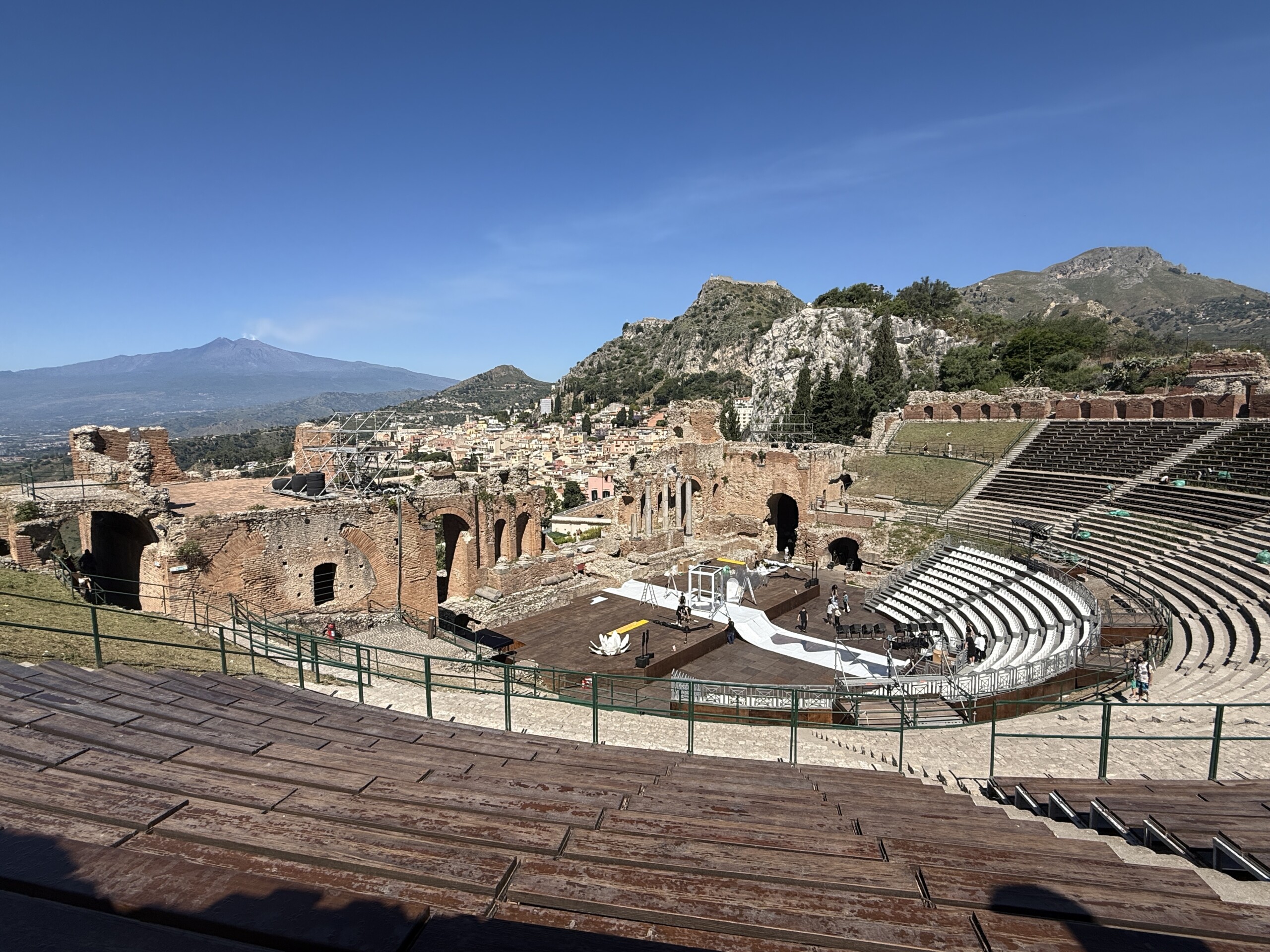 The theater faces Mt. Edna which represents(fire); on the east there is the Ionian Sea (water); the salty air represents (air) and all the stones represented (earth). We have been to other antiquarian theaters in the past, but this theater was dominated by the impressive Mt. Edna.