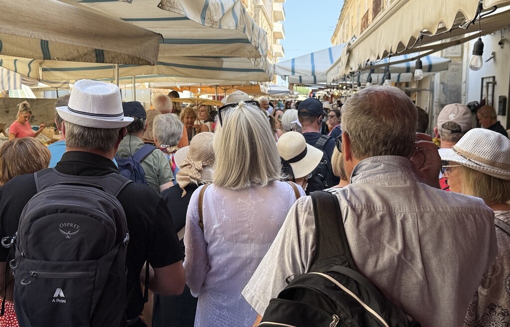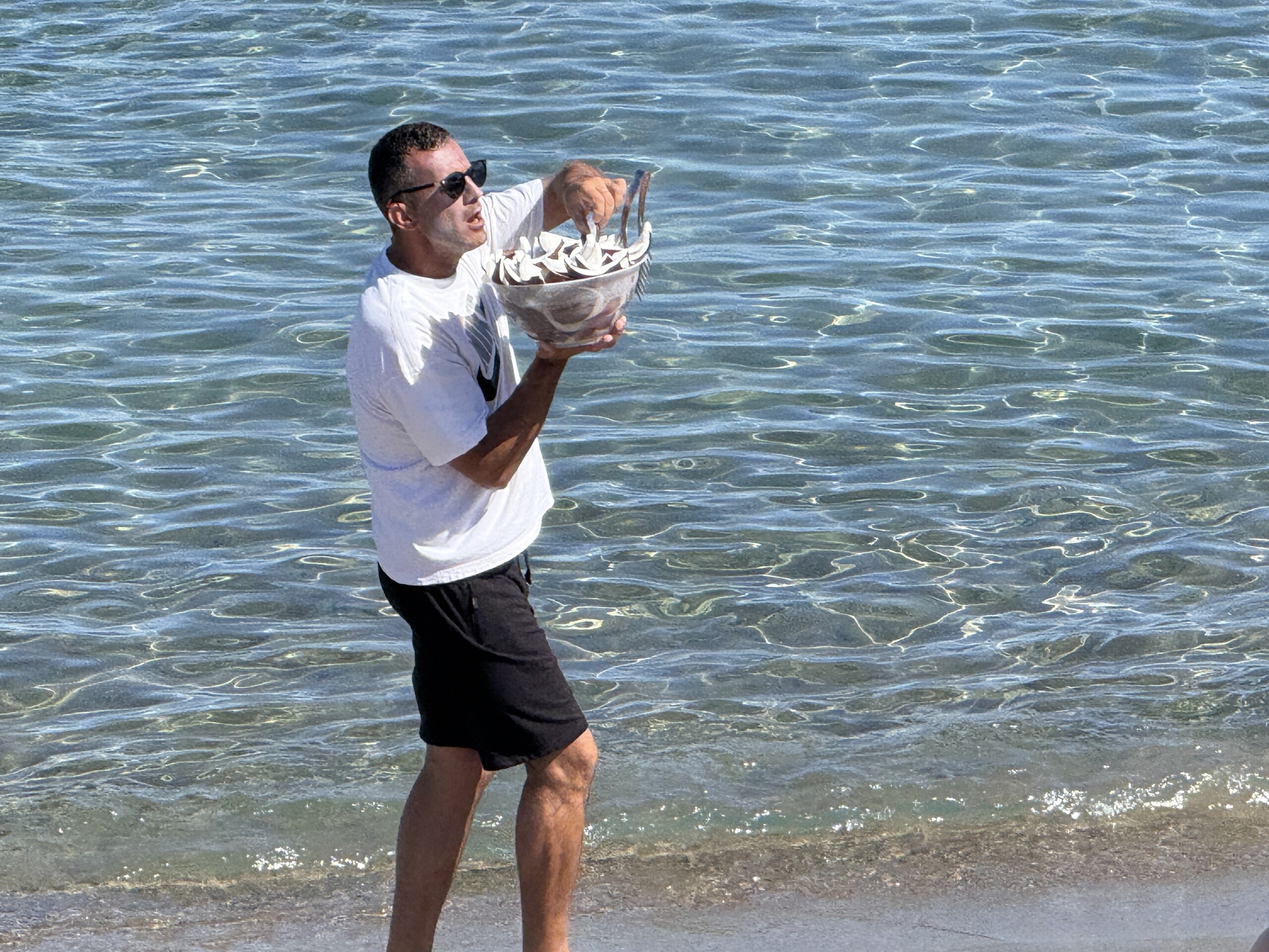Having “water-shoes” at the beach would have been welcomed. There was no sand, but all sizes of pebbles. Trying to walk to the cold water was excruciating. Eventually, I got there and had goggles for the 20–30-foot visibility. I was able to find a floating Italian “cork” which became my souvenir. Swimming off the Greek Isles in past years seemed a whole lot easier.