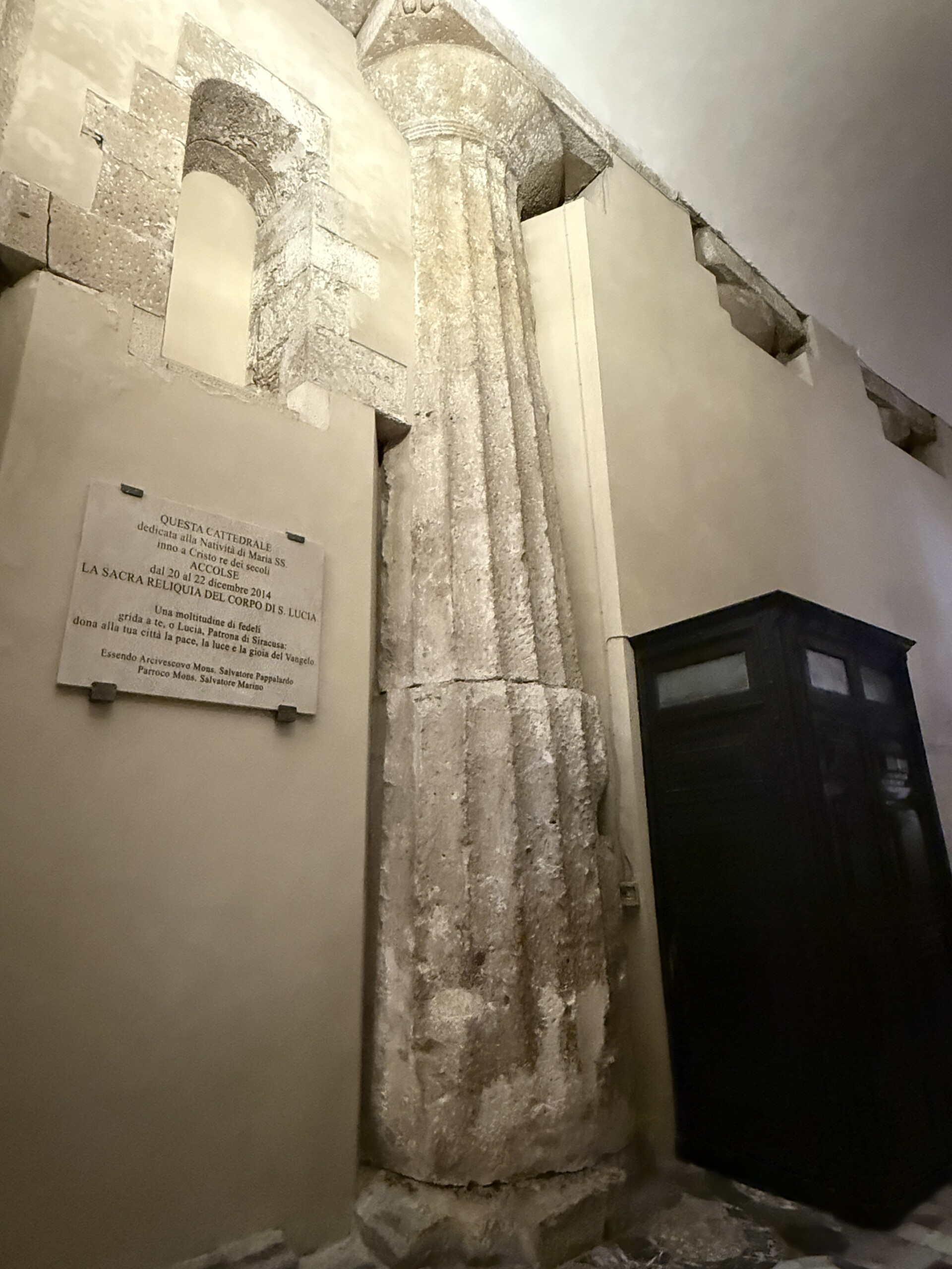 A short distance, too, is the Piazza Duomo, a large square which becomes a reference point for us. At one end is the famous Baroque style Siracusa Cathedral which dates back to the 1750’s AD. The original Doric columns of a Greek Temple from the 7th century B.C. can still be seen which is incorporated in the Cathedral. In 2005 this Cathedral was designated as a UNESCO World Heritage site. For the 2 Euro charge to enter this Cathedral, it is well worth the money.