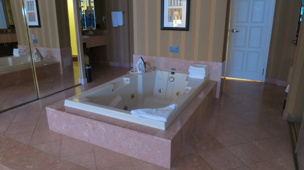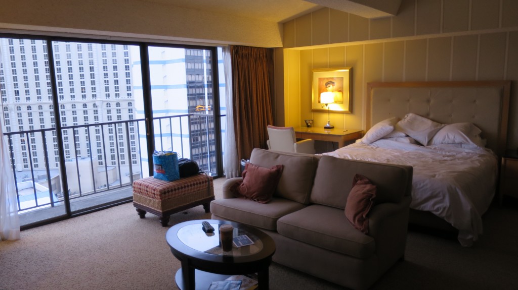 We have stayed at Bally’s several times. Most recently we received a great deal on the web. Somehow we ended up with a “smoking room.” For fifty dollars, we upgraded to a non-smoking suite. It was fortuitous as the room is three times as large as a regular room, and there was even a Jacuzzi bath included.