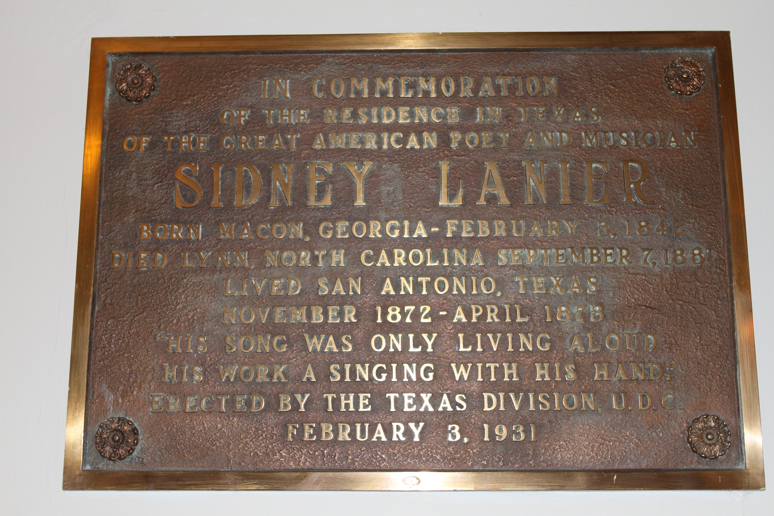 There is a plaque in the hotel for Sidney Lanier, a famous southern 19th century poet.  He is considered the “Poet of the Confederacy.” He was quite brilliant, but died early in his life at the age of 39 being expose to Tuberculous during the Civil War.