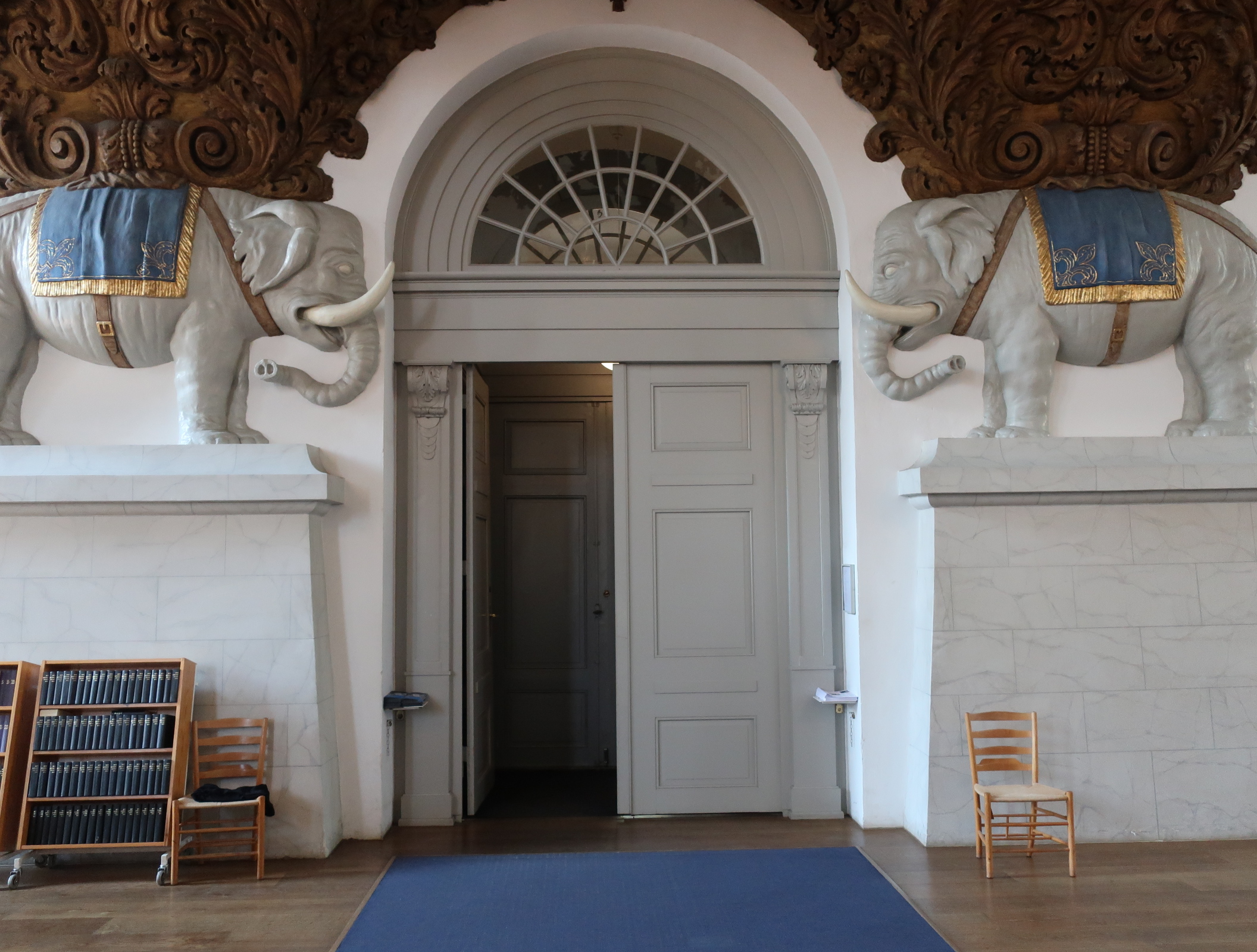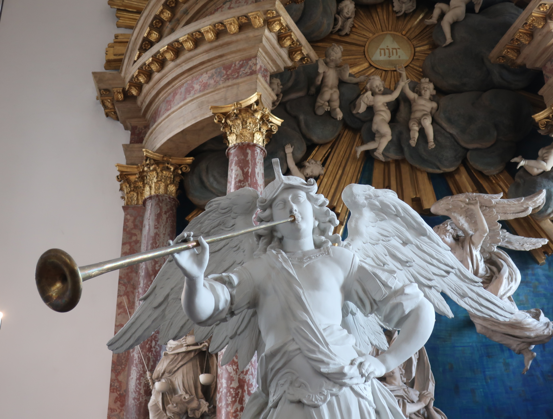 Inside the church there are several sculptures of note.  First, a spectacular sculptures angel.  And at the back of the church are two elephants!