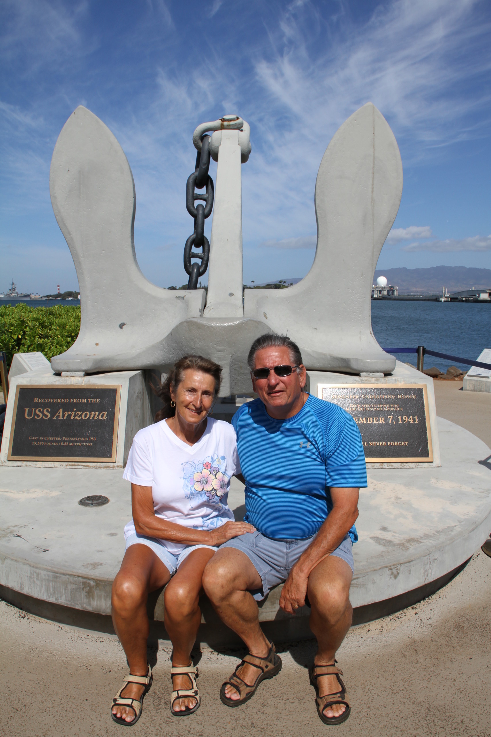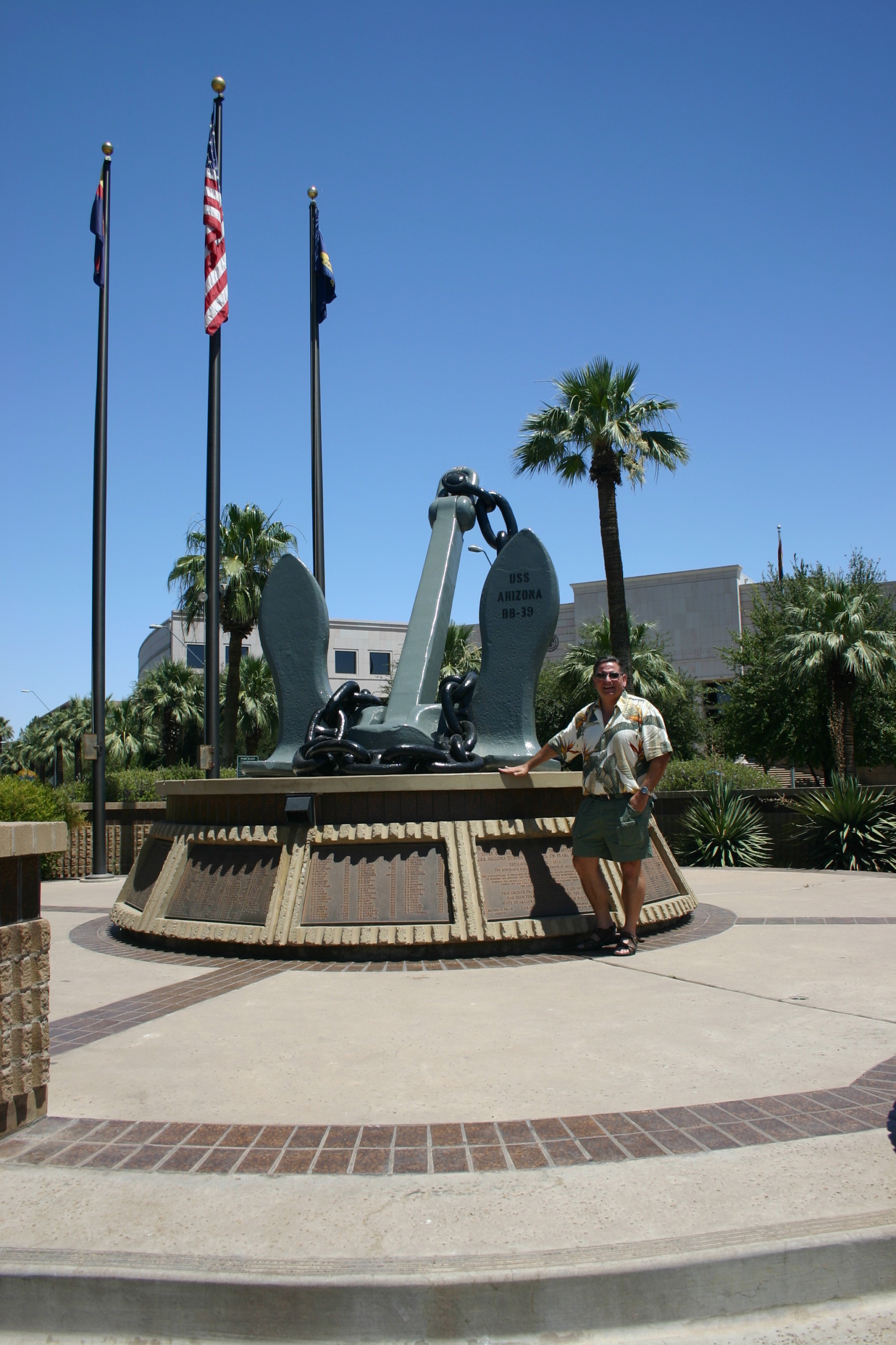 Our first adventure to Alaska was in 2004. Flying from PBI, we flew into Phoenix. We had a six hour lay-over. We rented a car and went to downtown Phoenix on a Saturday afternoon. Ironically, there was literally no one in the downtown district. It was at the beginning of July and it was well into the 100’s. An egg could be fried on the hood of the car. We were by ourselves at the USS Memorial Anchor. I have been blessed to have touched both anchors of the USS Arizona. The other is at Pearl Harbor in Oahu, Hawaii.