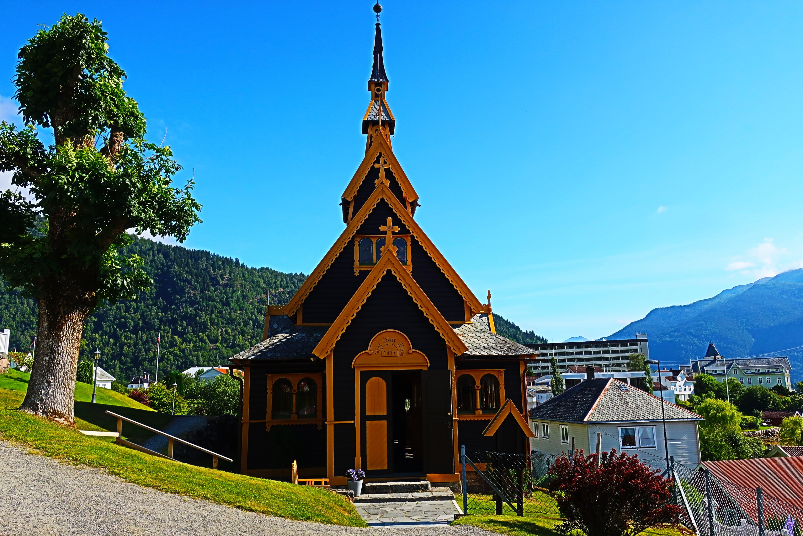 A walk through the village of Balestram will present itself with a stave looking church built in 1897. It was dedicated to an “English Woman” who died. She was married to the owner of the Kviknes hotel who loved her dearly.