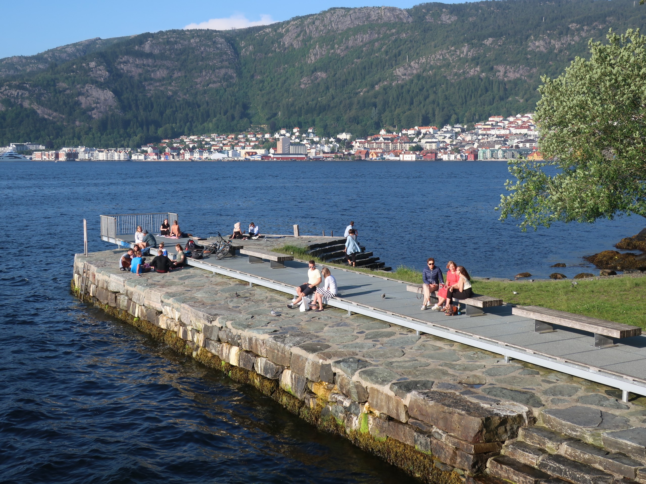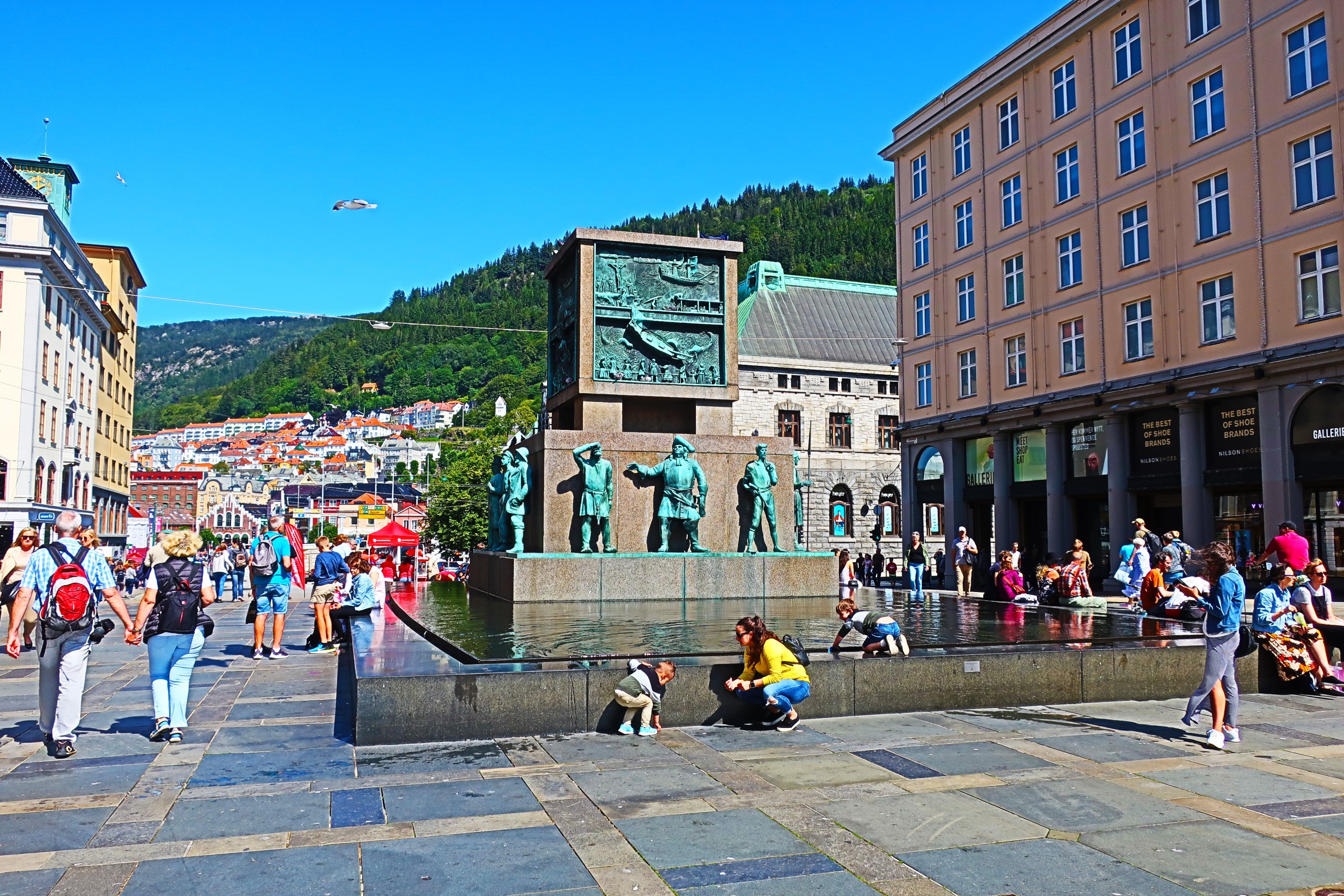 We had less than three full days to explore Bergen. There was a music concert in the park–filled with people on a nice day. We also realized the center of town is the famous “Sailor’s Monument” where people sit in the plaza. The artwork around the monument in 1979 is no longer.