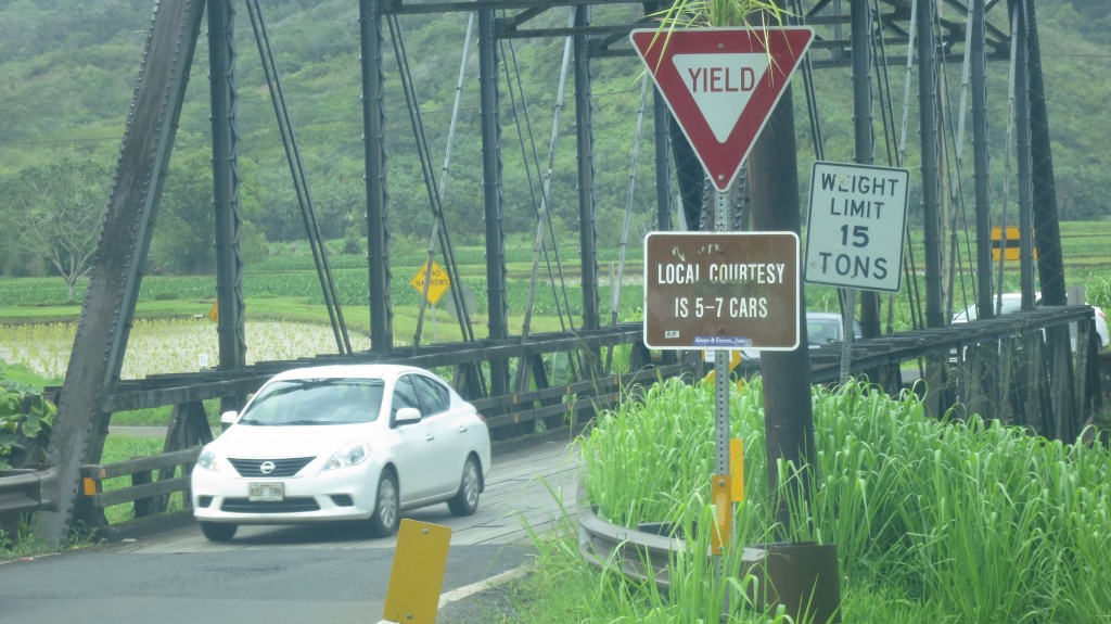 When you come to Hanalei, you have to cross a one lane bridge. There is “local courtesy” that states that five to seven cars may cross at a time. We have seen as many as ten cars travel across. “Shaka” rules, though, and your turn will come as you “hang loose.”