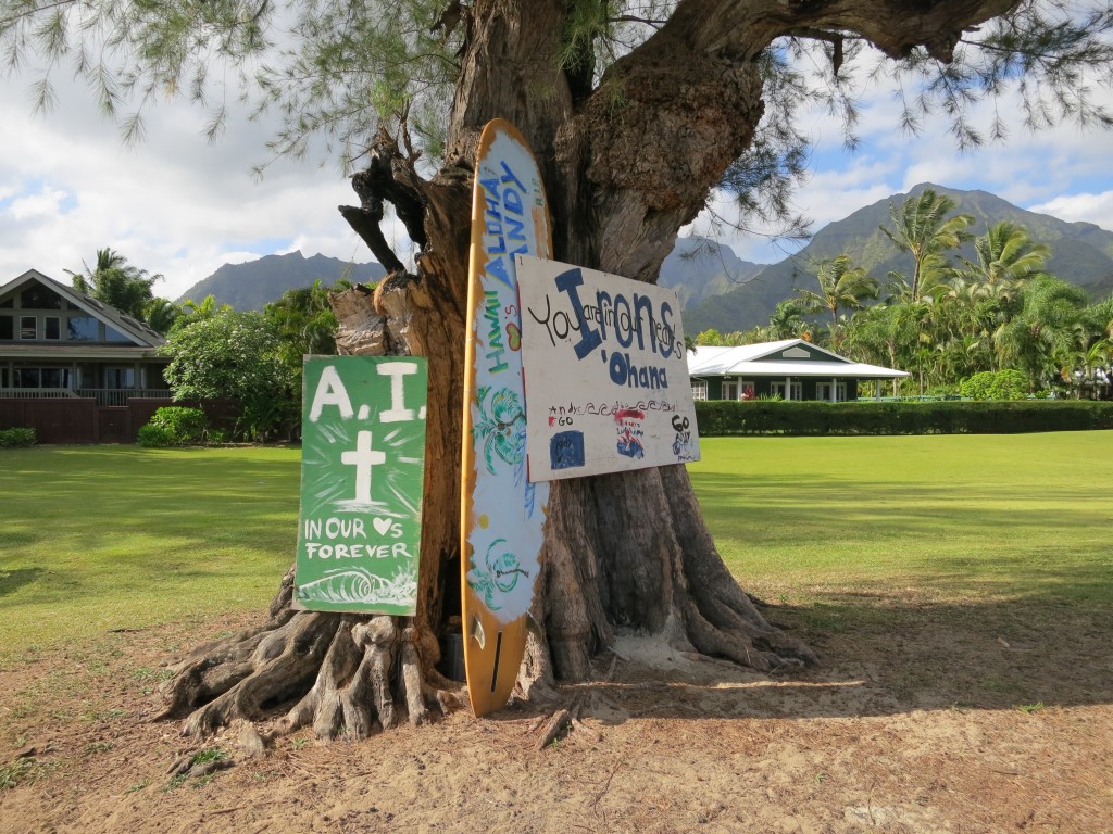 Hanalei Bay Beach is a beautiful crescent beach, with the “Bali Hai” mountains as a background. This is the area where Andy Irons, the famous Hawaiian surfer, came from. There are several signs in remembrance of Andy.
