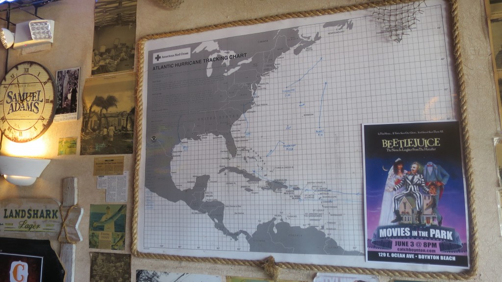 Hurricane Alley is decorated as a place of refuge and anything relating to hurricanes. There are a number of pictures of hurricane related items, history of Boynton Beach and bar memorabilia.