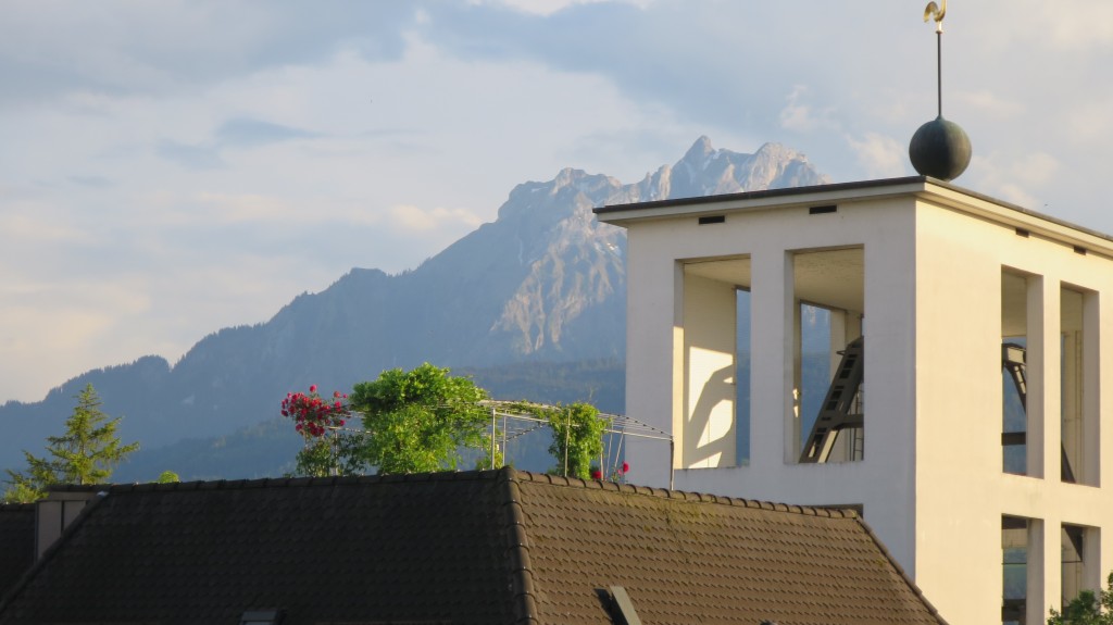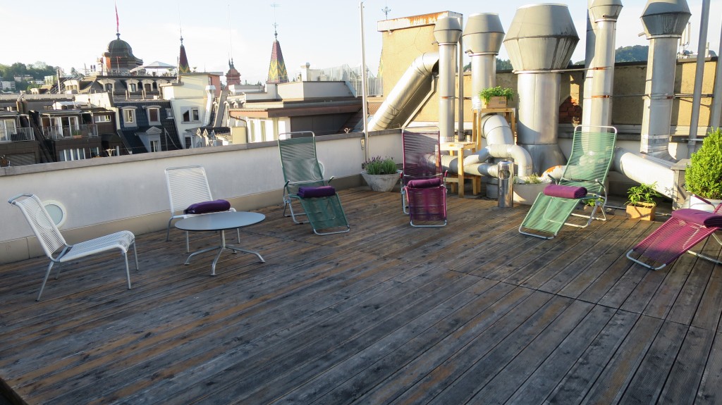 We learned on the last day that there is a terrace on the top floor. Six chairs are there with partial views of Mount Pilatus. I could never figure out how the fitness room worked.