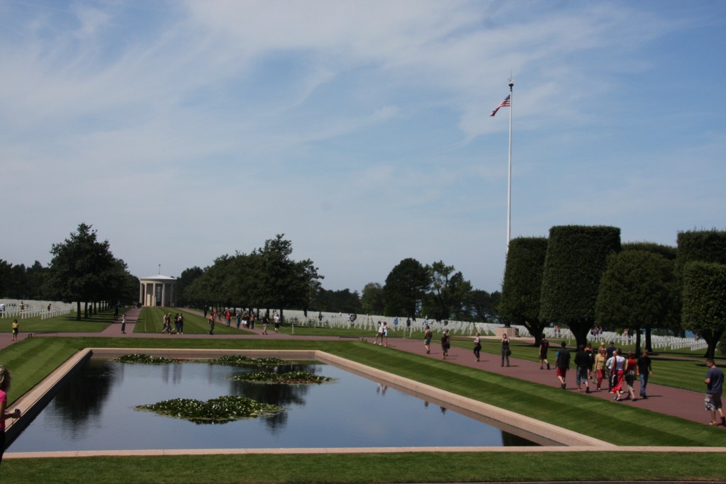 The American Cemetery at Colleville has a new visitors center. It is literally a museum that one can spend hours viewing. We walked the cemetery from one end to the other. Seeing over 9,000 graves is so sad. The cemetery literally overlooks Omaha Beach–peaceful and beautiful with the dark green grass and flowers. It is very quiet except with the birds and falling pine-cones.
