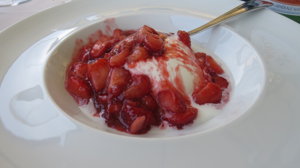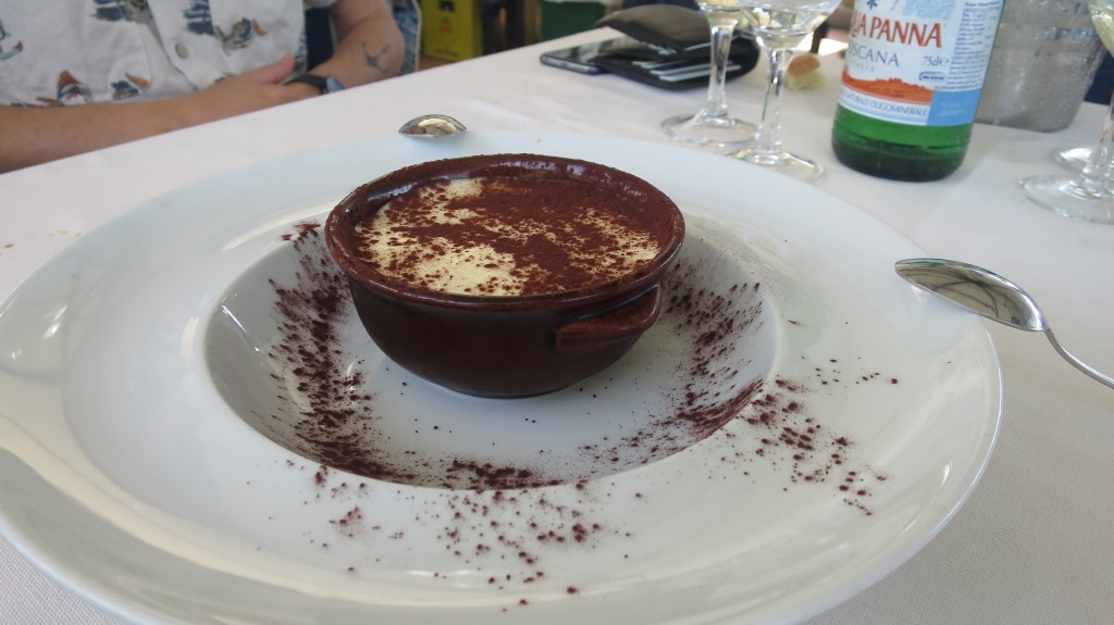 For dessert we had caramelized strawberries over vanilla ice cream—so good.  The two men beside us had Tiramisu.