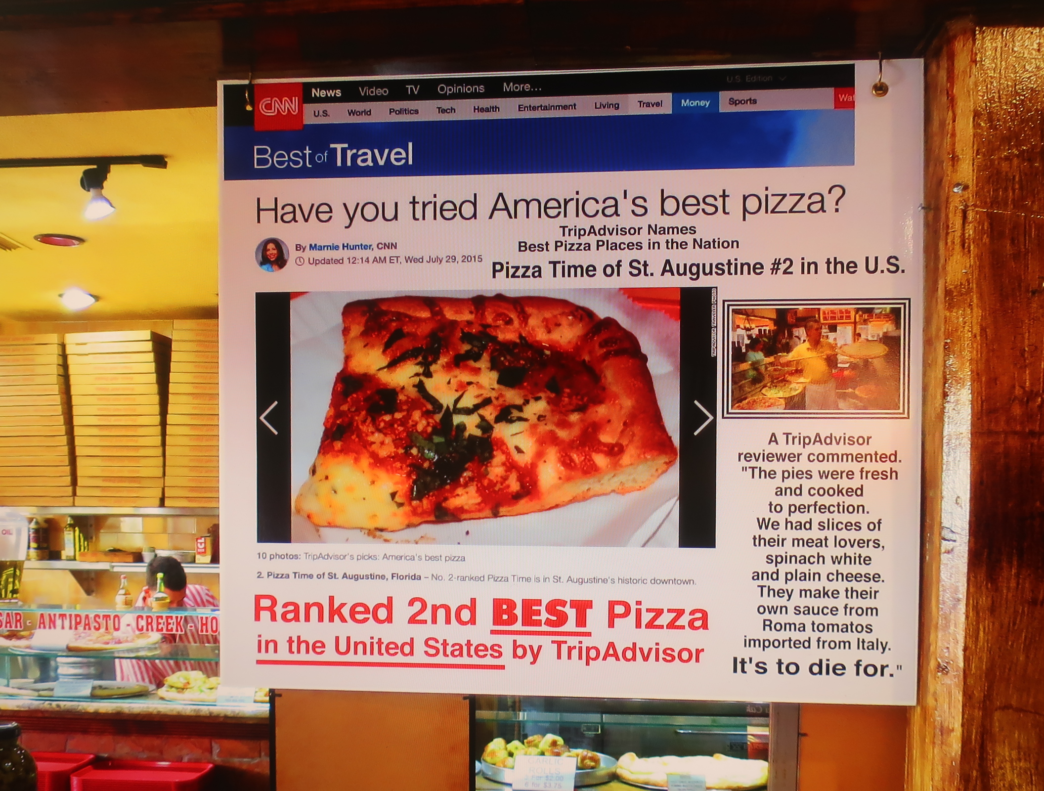 In 2014, we discovered “Pizza Time” on St. Georges. It was ranked as the #2 Pizza in the USA. There is usually always a line out the door. A slice of pizza will cost you about $6 dollars, cash. There is an ATM machine close to the register. No credit cards at this popular place.