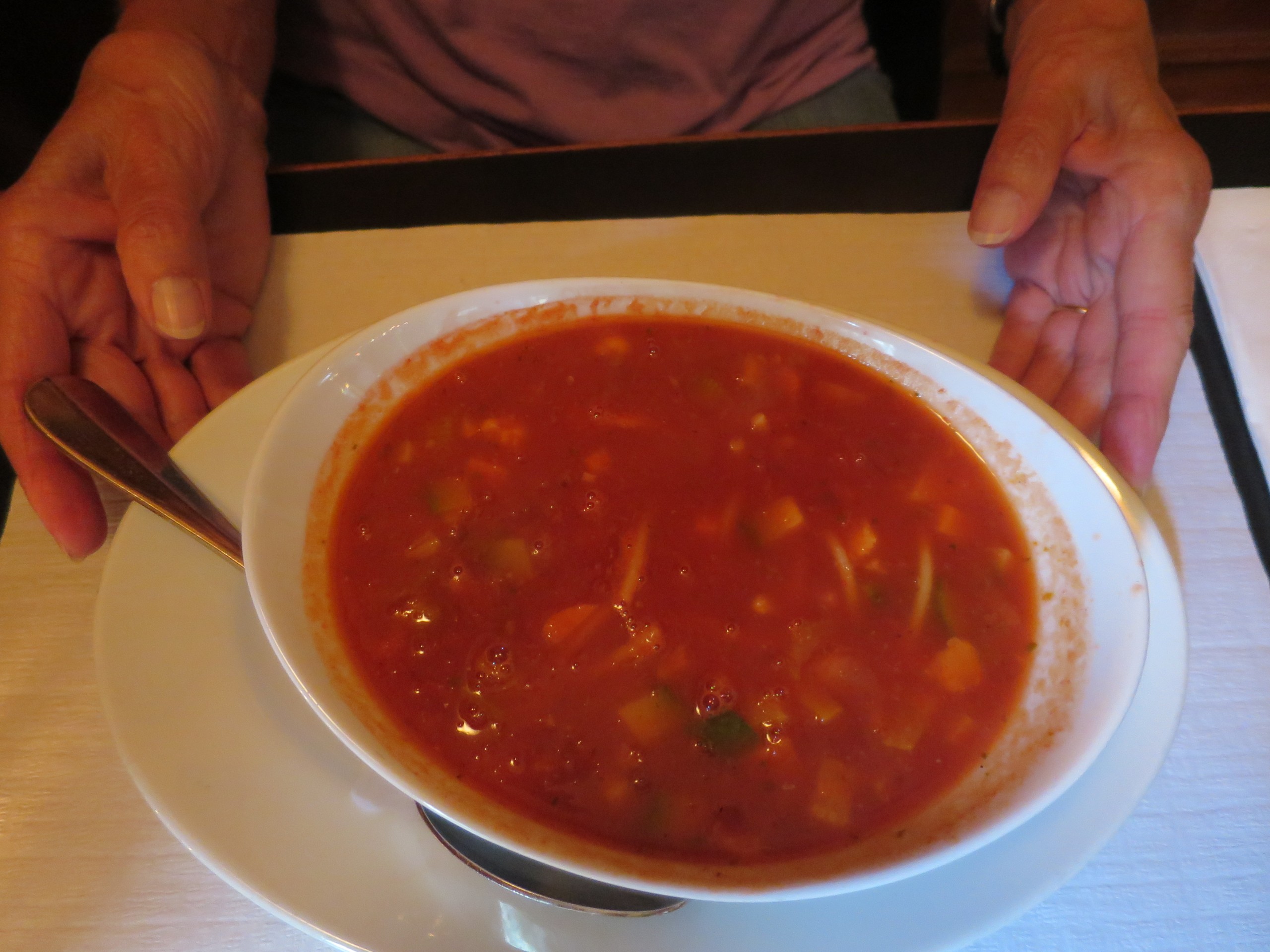 We were so fortunate to obtain a table that someone had just canceled moments before. Kathie had fresh homemade soup and I loved the “Four Cheese Pizza” made with Blue Cheese—so delicious.