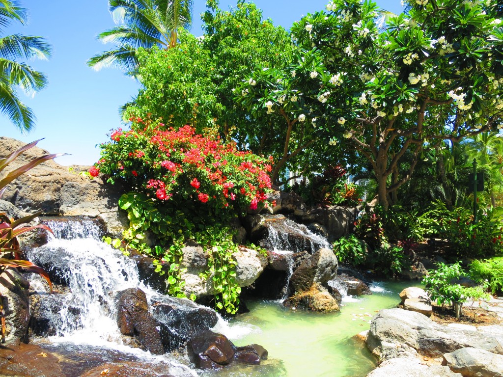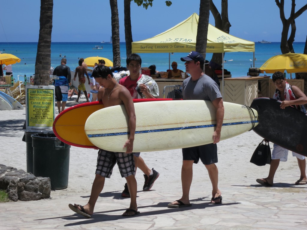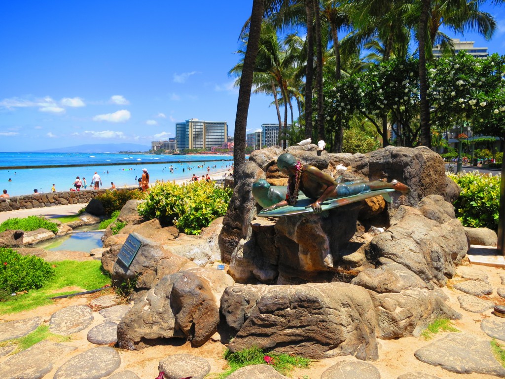 Most of the people just walk along the beach sidewalk admiring Duke Kahanamoku’s statue, the waterfall and attend the Hula show at night.